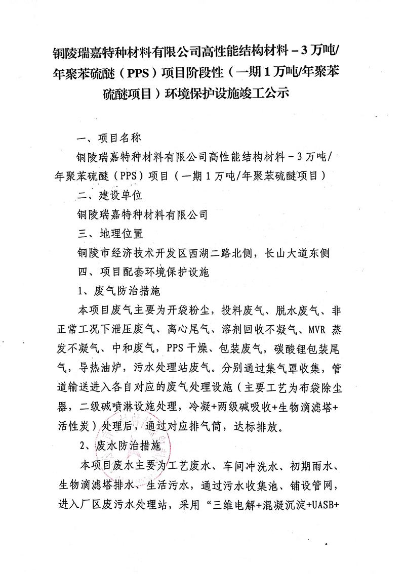 高性能結(jié)構(gòu)材料-3萬(wàn)噸/年聚苯硫醚(PPS)項(xiàng)目 階段性(一期1萬(wàn)噸/年聚苯硫醚項(xiàng)目) 環(huán)境保護(hù)設(shè)施竣工公示